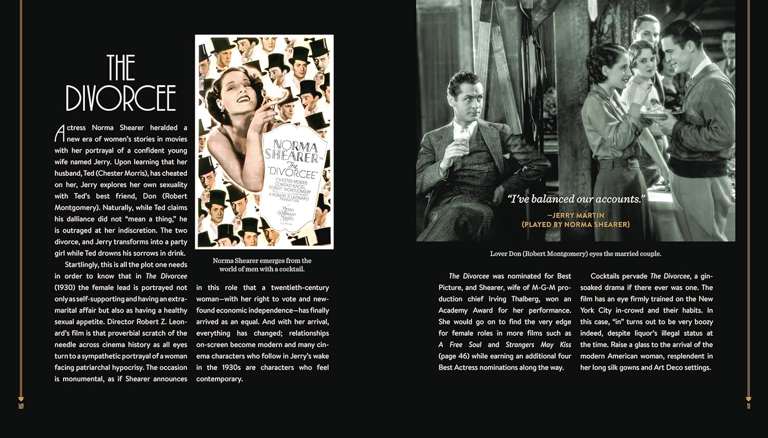 The films in retrospect are highly entertaining to watch, and Darlington pairs a cocktail recipe per film, offering both original and classic Prohibition-era elixirs for readers to indulge in. One of the films featured in the book titled “The Divorcee,” (1930) features actress Norma Shearer showcasing her portrayal of a determined woman who cheats on her husband in revenge for his indiscretions causing a break-up in the marriage. The storyline is a classic example of a pre-code film, and Darlington perfectly pairs a martini to coincide with the film featuring gin, dry vermouth, and Lillet Blanc with orange bitters and ice. In terms of pre-code storylines, women in particular take center stage and evolve into more progressive characters. Darlington adds, “We suddenly get women’s stories, and we get them from a sympathetic point of view and it’s really revolutionary. In 1930, when Norma Shearer walks on stage in “The Divorcee” and demands equality as a woman who has the right to vote. And she’s financially independent and wants to be sexually equal as well while her husband cheats on her. And then she balances the account by cheating on him back. This was a big deal culturally, and still is.”