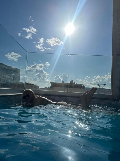 I did go to Cannes Film Festival to cover the hot topics and so I eventually found some really hot topics which I am excited to share with you. I found the amazing Hotel Cristal. The room was so comfortable, with an amazing bathtub, beautiful toilet and a bed that made you fall asleep in 5 minutes. Which in Europe is very hard to find. The best part was that the hotel had a wellness spa on the roof top which included a warm pool, sauna, and Hammam (steam room). When in Europe especially this is important as one walks many miles a day and it’s really hard to feel really clean, at least for me! The spa saved me and rejuvenated me daily! Plus, the hotel was literally 2 blocks from main street called Boulevard de la Croisette so need to spend on Ubers. I was swimming one evening enjoy the sunset and met a very handsome talented British actor Louis James who starred in the movie River of Blood which premiered at the festival. He was very interesting and I might say a charmer, check out his interview for The Hollywood Times: