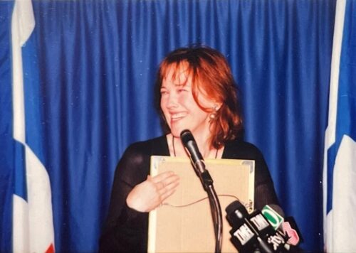 O’Hara at the SCTV Day Event in the Members’ Lounge of Toronto City Hall with Mayor Hall, 1995