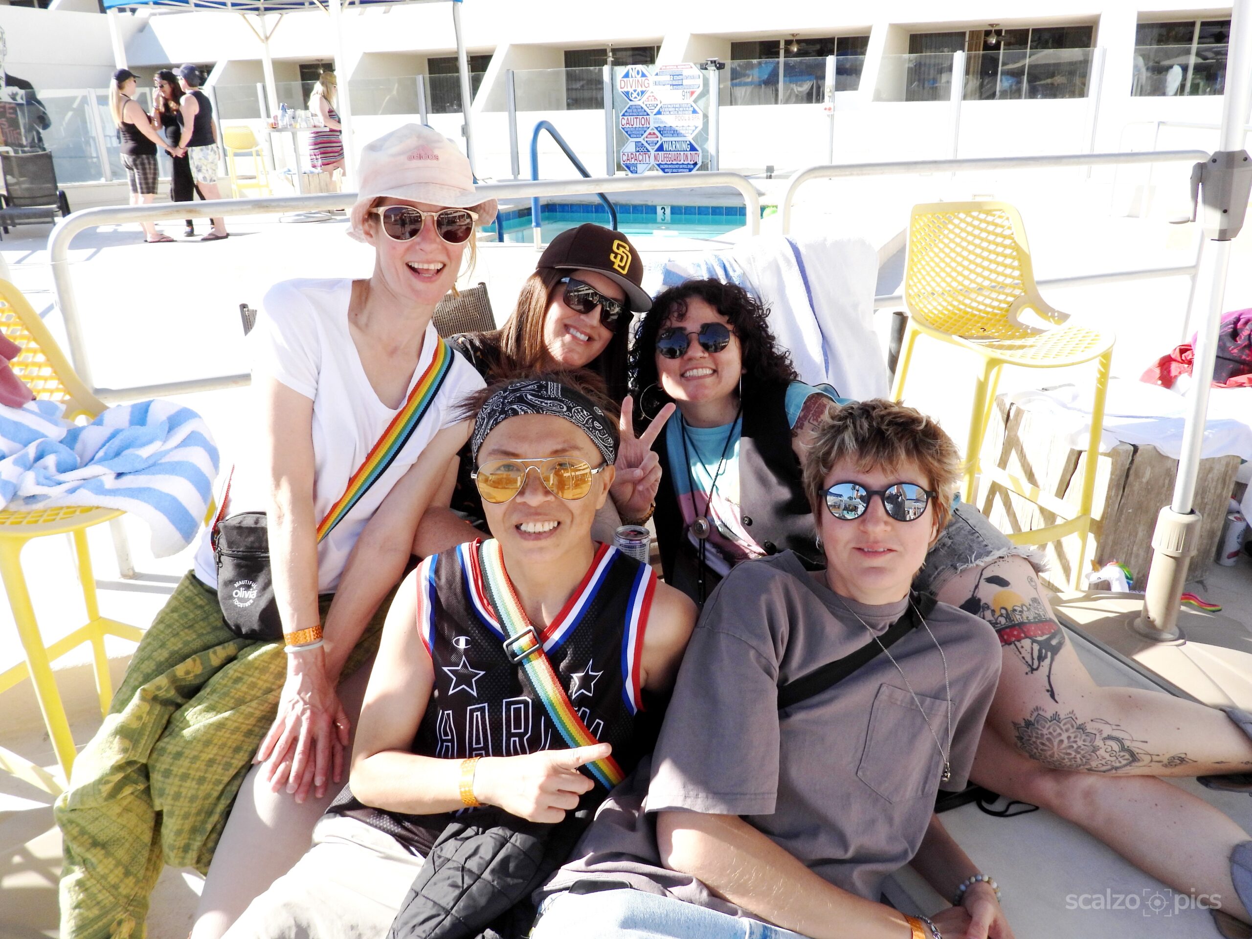 The pool area buzzed with energy, becoming a vibrant hub for conversation, swimming, and soaking up the stellar Palm Springs sunshine. The laid-back atmosphere encouraged guests to relax, mingle, and take in the beautiful desert scenery. Among the standout moments was the lively Rubber Duck and Unicorn Relay Contest, leading up to the grand finale: a tattoo competition sponsored by Outer Limits Tattoo. Women signed up in advance for quirky categories like Gayest Tattoo, Best Matching Tattoos, and Best Breakup Story. Emcee Corday kept the crowd engaged, inviting each participant to share their personal story behind their ink before presenting it to the poolside panel of judges.