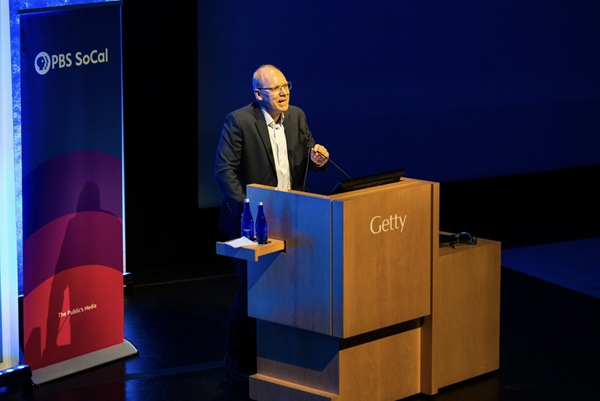 PBS SoCal President and CEO Andrew Russell delivers a rousing and inspiring speech on the status of public media at PBS SoCal’s ART & SCIENCE COLLIDE premiere at The Getty Center on October 14, 2025.