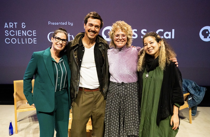 Moderator Dr. Cara Santa Maria, Artist Cannupa Hanska Luger, Artist Lauren Bon and Director Jessica Kingdon at PBS SoCal’s ART & SCIENCE COLLIDE premiere at The Getty Center on October 14, 2025