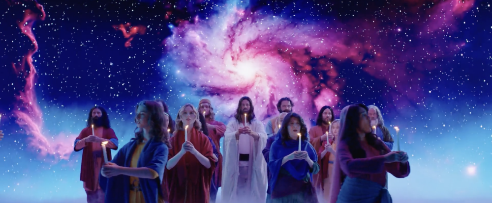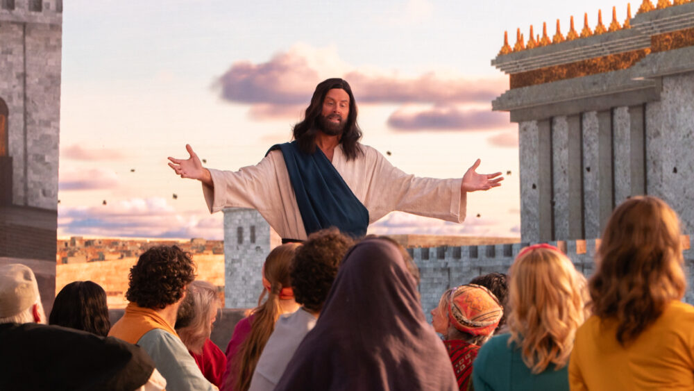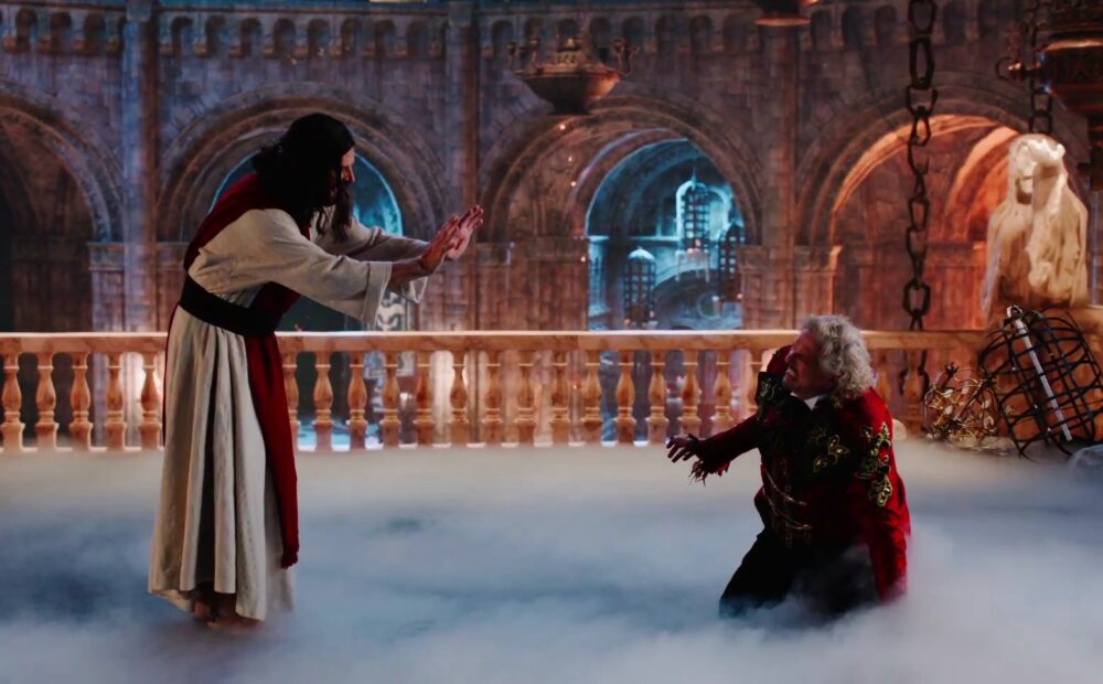 The final confrontation arrives with a heightened theatricality—Belzebuth reappearing in full force, almost celebratory, claiming authority, while Yeshua returns in white, marked visibly by the wounds in his hands. There is no physical struggle, only declaration. When he speaks of laying down his life and taking it up again, and of holding the keys of authority, the moment shifts fully into symbolism. Belzebuth attempts to negotiate—“can we make a deal?”—but the response is absolute. He is cast down, not by force, but by presence. The scene resolves not as a battle, but as a transfer of authority, expressed through language, image, and tone rather than action.