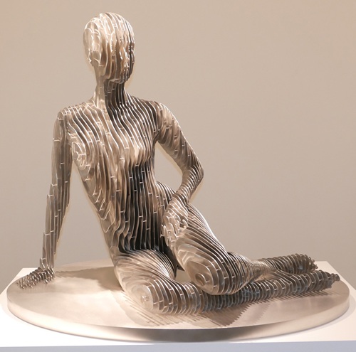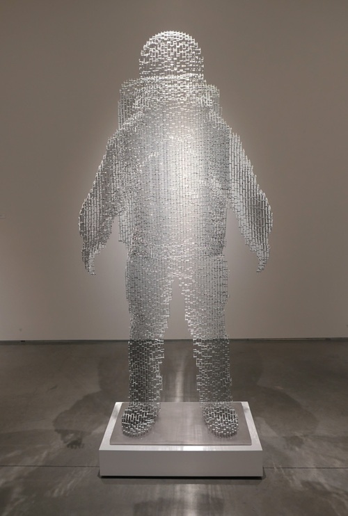 Julian Voss-Andreae: That is a succession of an older piece. Similar to the art of Degas. I describe the human body as a bunch of triangles. Depending on where they are in the body, I make them smaller or bigger. The whole thing was designed on computer and then 3-D printed in sections and then cast in bronze and welded together. Then I take pieces of glass and use the outline from each triangle and then slump the glass overnight in a kiln giving it the curvature. Then I cut it out and glued it to the slot. Each glass piece takes a lot of work.