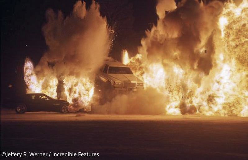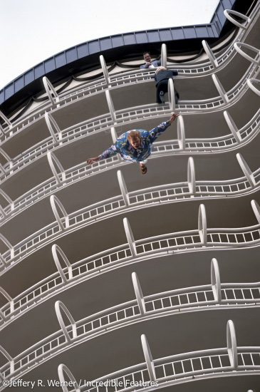 JW: Dar Robinson inspired me. What a great guy he was. He died way too young. He said “Jeff, I’m doing a movie in Miami with Burt Reynolds (called Stick) and I’d like you to be there.” It was two high-falls from the 22nd floor dressed for two different characters in the movie, including the bad guy he was playing. The second stunt I shot from the ground with a camera on another building as well. Burt said a prayer for him before his stunt. He made us all bow our heads. This had never been done before. In this movie Stick instead of an airbag (which I had photographed him and other stuntmen and women many times) he had a whole contraption that went around the building and would gently stop him by his ankle around the 5th floor. The camera could be right overhead. Dar also played the bad guy in the movie and could shoot all six rounds from a gun at Burt dropping backwards.