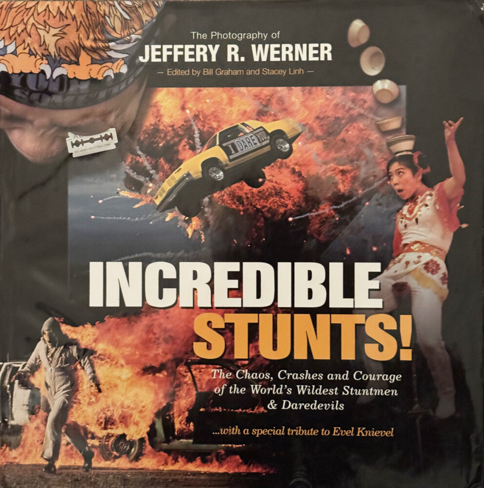 Even though I am a writer I hired a writer to assist. My ghost writer wrote the Evel Knievel story in first person. And another old print editor of mine from my writing days who helped write a lot of the captions. We had a girl do the color conversions and then we had to decide which pictures needed to be drum scanned and which could be scanned on our own scanner. I took two trips to Florida to design and redesign. The designer came up with the idea of putting four or five stunt photo spreads at the beginning like a prologue. I went to ASMP where they had a book meeting with the guy who published a book of his photos called Skin. He said the worst mistake he made was to not to go to the press run in China because they screwed up the colors on some of the pages. We found a printer who would do it at a reasonable price including the shipping. Stacy and I went to the press check run in Korea. Sure enough, there were a few pages that needed fixing. I went to Germany twice where they have the world’s biggest book convention and also to a convention here in L.A. and we found a distributor.