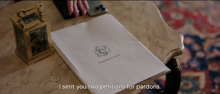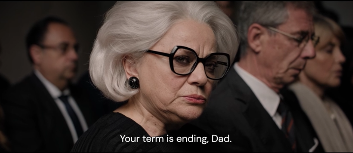 Although De Santis has been a brilliant jurist throughout his career, he offloads his legislative work onto his staffers. Most notable among them is his daughter, Dorotea (Anna Ferzetti), who micromanages every aspect of his life, right down to his diet. The president has taken historically decisive actions, but between his age, the degree to which he’s been catered to up to this point in his life, and the moral minefield of the euthanasia bill, he now finds himself in a state of docility. As a man of reason, he worries that not signing the bill would make it easy for people to label him a torturer, and as a Catholic, he worries that signing it would make him a murderer. He even visits the Pope (Rufin Doh Zeyenouin), a personal friend, to discuss his dilemma.