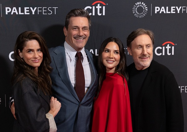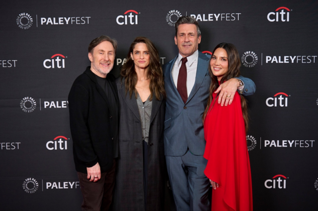 Jonathan Tropper, Amanda Peet, Jon Hamm, and Olivia Munn attend “Your Friends & Neighbors” season two during PaleyFest LA at the Dolby Theatre in Hollywood on April 11, 2026 (Photo Credit: Courtesy of The Paley Center for Media)