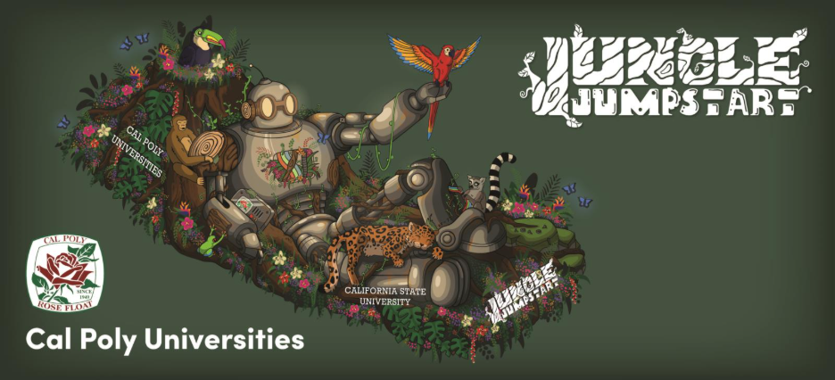 A creative collaboration between Cal Poly Pomona and Cal Poly San Luis Obispo, the student-built “Jungle Jumpstart” float explores the harmony between nature and technology through the story of rainforest animals working together to repair and restore a friendly robot. Lemurs, frogs, monkeys, and a jaguar unite to bring their mechanical companion back to life, illustrating how teamwork and innovation can achieve incredible results. Cal Poly Universities’ breakthrough animation system will bring the float to life, dazzling audiences at every turn. The robot is decorated with a blend of blue corn grits and dusty miller accented with patches of high magic roses that echo the jungle palette of greens, reds, and yellows. Around it, the jungle animals are brought to life through material choices— bronze chrysanthemums and pampas grass create textured fur, while orange and lemon peels depict vibrant bird feathers. Reflecting Cal Poly’s “Learn by Doing” spirit, the float captures the parade theme “The Magic in Teamwork” with dazzling motion, glowing features and vibrant floral detail symbolizing the power of collaboration and imagination to help both nature and technology thrive.