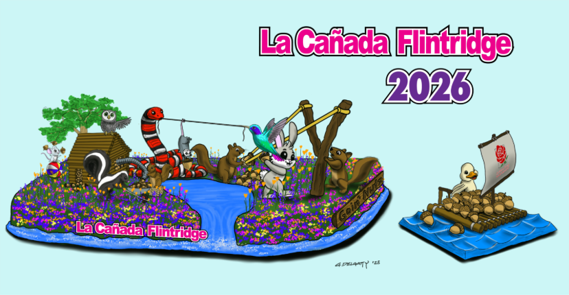 The La Cañada Flintridge Tournament of Roses Association’s 47th self-built float, “Goin’ Nutz,” dives into the forest where a team of clever critters and Rube Goldberg-style engineers rally together to deliver acorns from their emergency nut supply to community members in need. Inspired by the resilience and unity shown after the Eaton Fire, the whimsical design celebrates cooperation and problem-solving as forest friends use inventive gadgets and teamwork to navigate a playful woodland adventure. The float includes in a variety of creative decorating materials, with a bunny covered in bunny tails, cotton, and pink rose petals, a vibrant hummingbird brought to life with a variety of rose and gladiola petals, a helpful snake covered in red, white, and dark purple carnations, a skunk with fat choy and white mums, and squirrels covered with palm fiber and pampas grass. True to La Cañada Flintridge’s tradition of humor, creativity, and community spirit, “Goin’ Nutz” captures The Magic in Teamwork in full bloom.