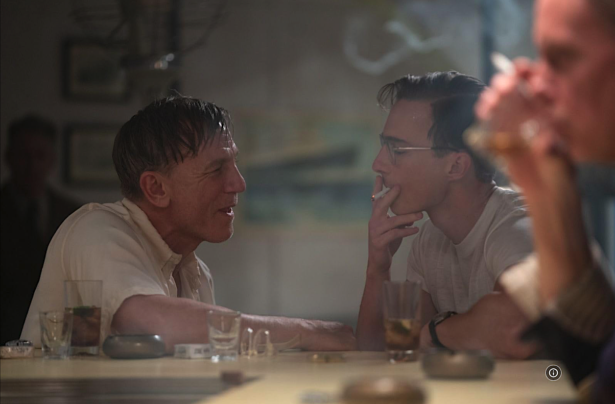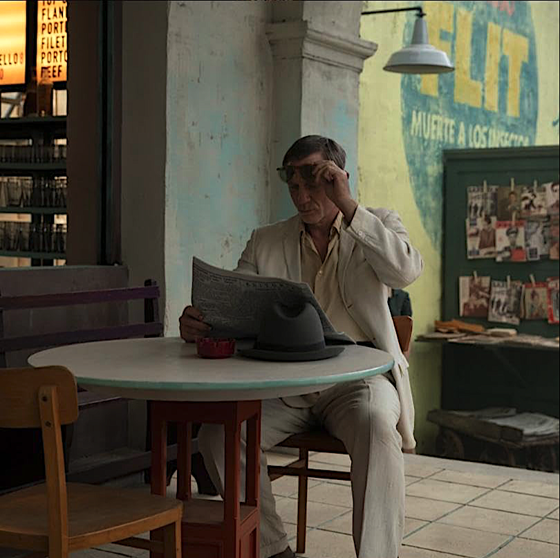 Daniel Craig with his bruiser face and odd glasses wanders drunkenly around a fever-dream vision of Mexico City created on the backlots of Rome’s Cinecittà Studios. The sheer homoerotic artifice on display is clearly tuned into Fassbinder’s Querelle, with even the driblets of sweat on people’s bodies are beguilingly overdone. Craig’s performance matches Guadagnino’s vision of Lee’s character. The film recalls the pathetically degraded boytoy from the 1998 Francis Bacon faux-biopic Love Is the Devil, as he labors to convey Lee’s destructive infatuation with the opaque, icily handsome Eugene Atherton (played by Drew Starkey).