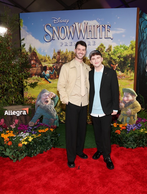 LOS ANGELES, CALIFORNIA – MARCH 15: (L-R) Joshua Colley and Malachi Barton joins Sneezy & Sleepy at the Allegra activation on the red carpet for Disney’s “Snow White” premiere at El Capitan Theatre on March 15, 2025 in Hollywood, California. The Allegra activation asks what Sneezy and Sleepy would be like if they weren’t sneezy or sleepy. (Photo by Phillip Faraone/Getty Images for Allegra)