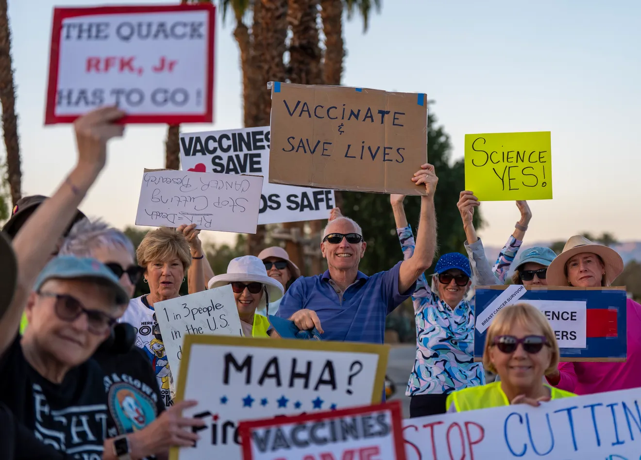 Protestors hold up their signs along Portola Avenue outside of the Starry Starry Night Gala ahead of the arrival of U.S. Health and Human Services Secretary Robert F. Kennedy Jr. at Chaparral Country Club in Palm Desert, Calif., Saturday, Jan. 31, 2026.