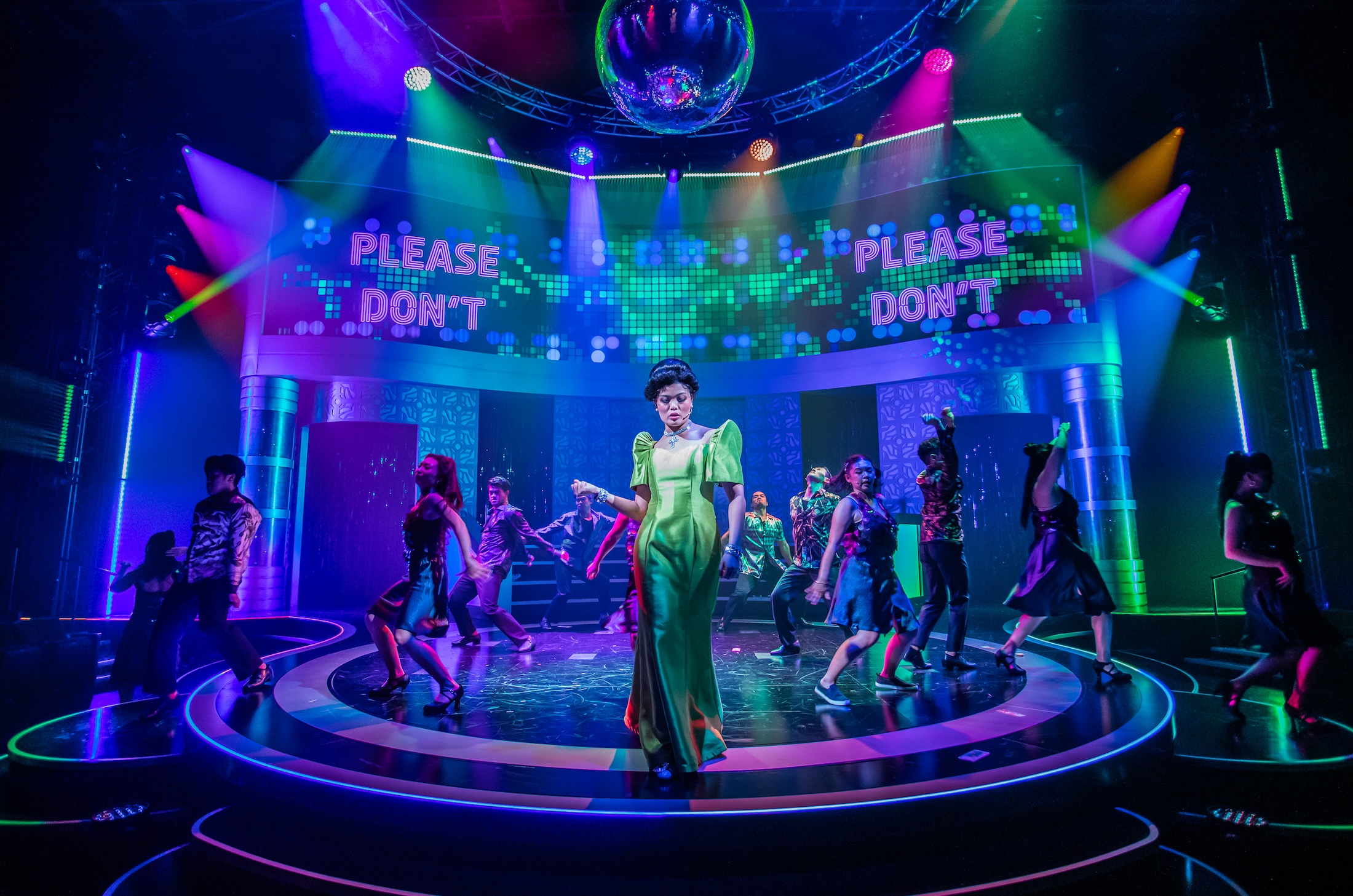 The Mark Taper Forum has been transformed into a neon-drenched disco for Center Theatre Group’s West Coast premiere of Here Lies Love. Directed by the Center Theatre Group’s Brindell & Milton Gottlieb Artistic Director Snehal Desai, the production attempts to turn the rise and fall of Imelda Marcos into an immersive cautionary spectacle.