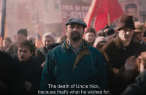The New Year That Never Came came out of director-scriptwriter Bogdan Muresanu’s The Christmas Gift, a 2018 short film that “evoked a child’s -eye-view of political terror via an inadvertent act of protest. There’s a nod in this feature length film to this by way of a child’s letter to Grandfather Frost (Santa Claus) containing a line about “Uncle Nick” that causes his father, Gelu (portrayed by Adrian Vancica), to comically but also understandably freak out and worry that he will get into big trouble. He finds out that his young son has just mailed a letter to Santa, in which he expresses his wish for “uncle Nick to die” as a Christmas gift for his father, “Uncle Nick” being a nickname the entire country gave to the all-powerful dictator Nicolae Ceauşescu.